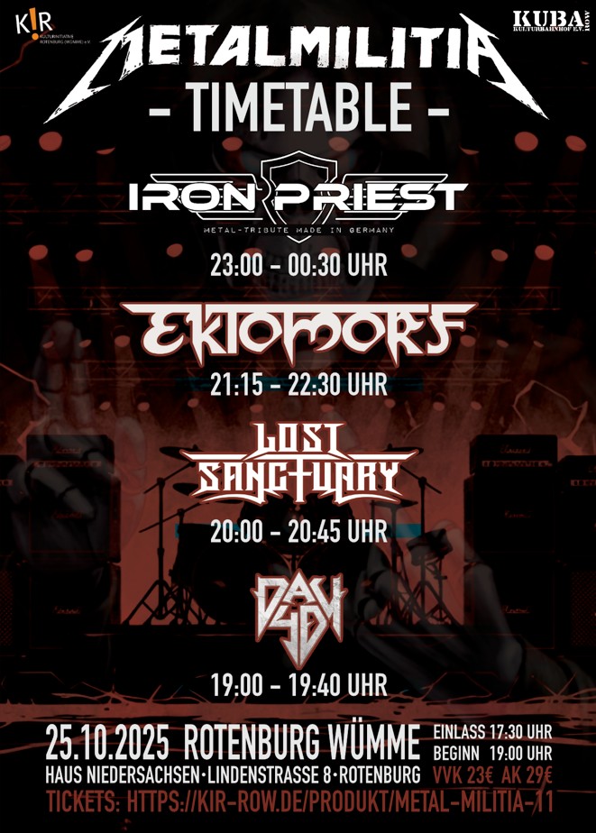 KuBa (Kulturbahnhof Rotenburg e.V.) in Zusammenarbeit mit der Kulturinitiative Rotenburg (KIR) präsentieren am 25. Oktober 2025: Metal Militia 11 - eine geballte Ladung Metal mit internationalen Top-Acts und lokalen Highlights.